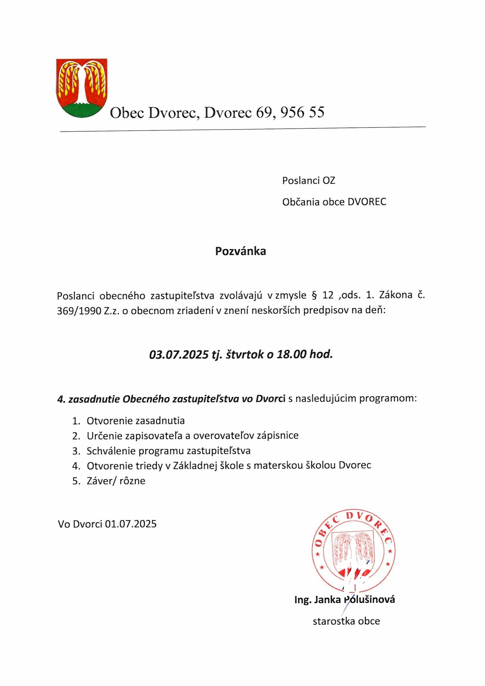 Poslanci obecného zastupiteľstva zvolávajú 4. obecné zastupiteľstvo vo Dvorci, ktoré sa bude konať dňa