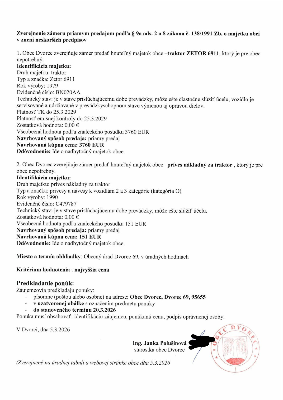 Obec Dvorec zverejňuje zámer predať -traktor ZETOR 6911 a príves nákladný za traktor