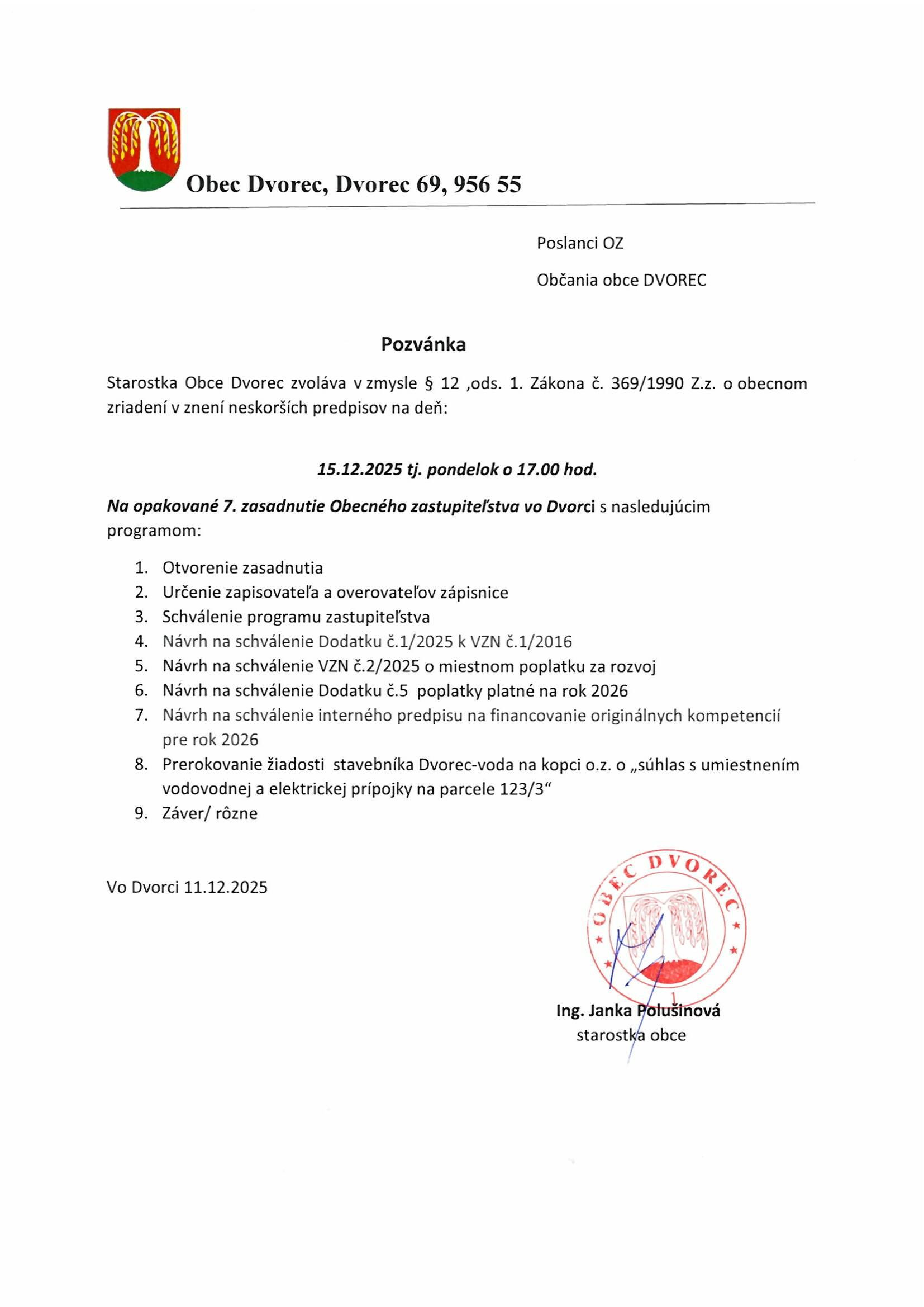 Pozvánka na opakované 7. zasadnutie OZ vo Dvorci dňa 15.12.2025