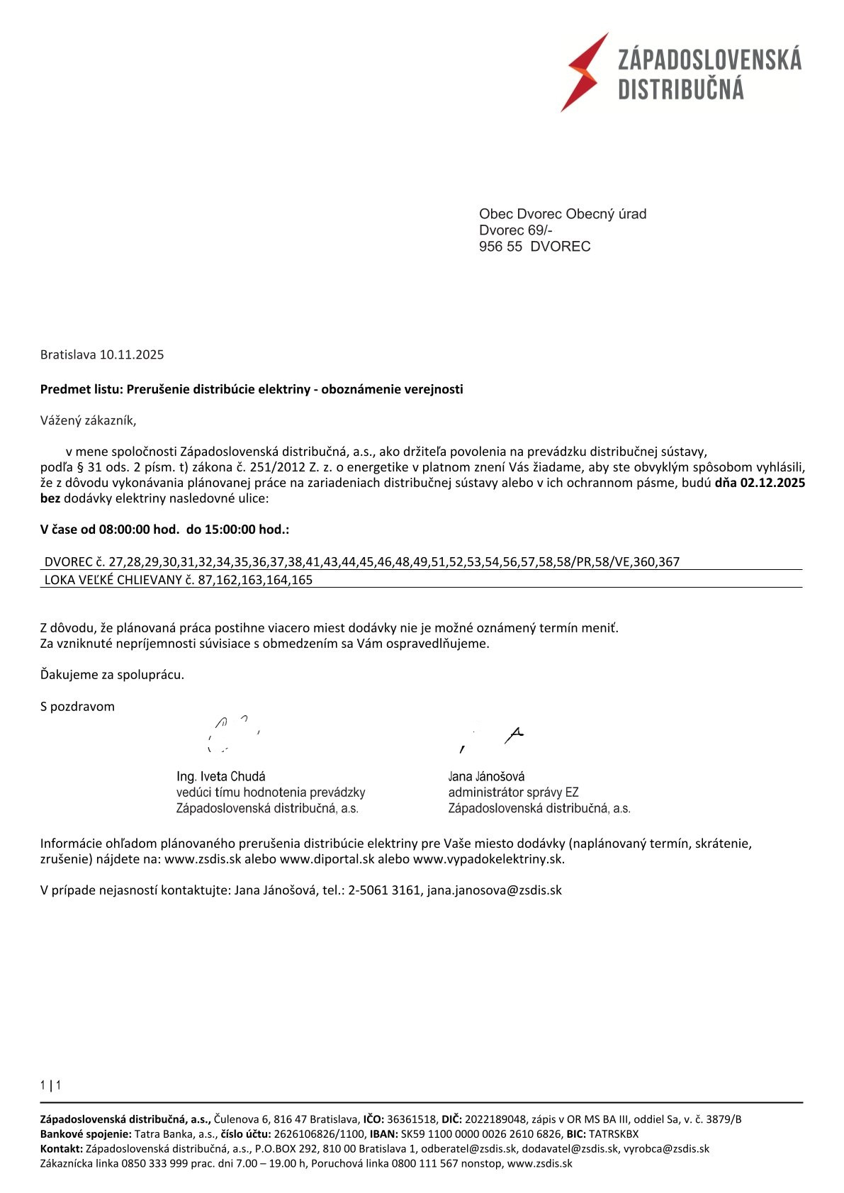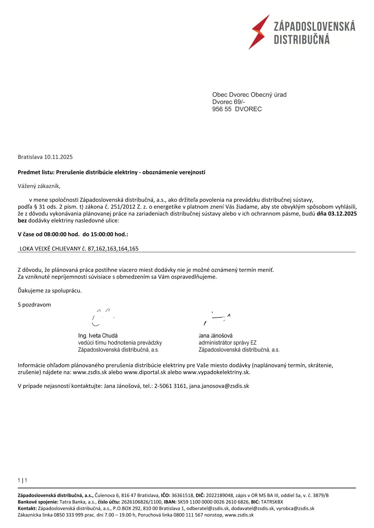 Prerušenie distribúcie elektriny 2.12 a 3.12.2025