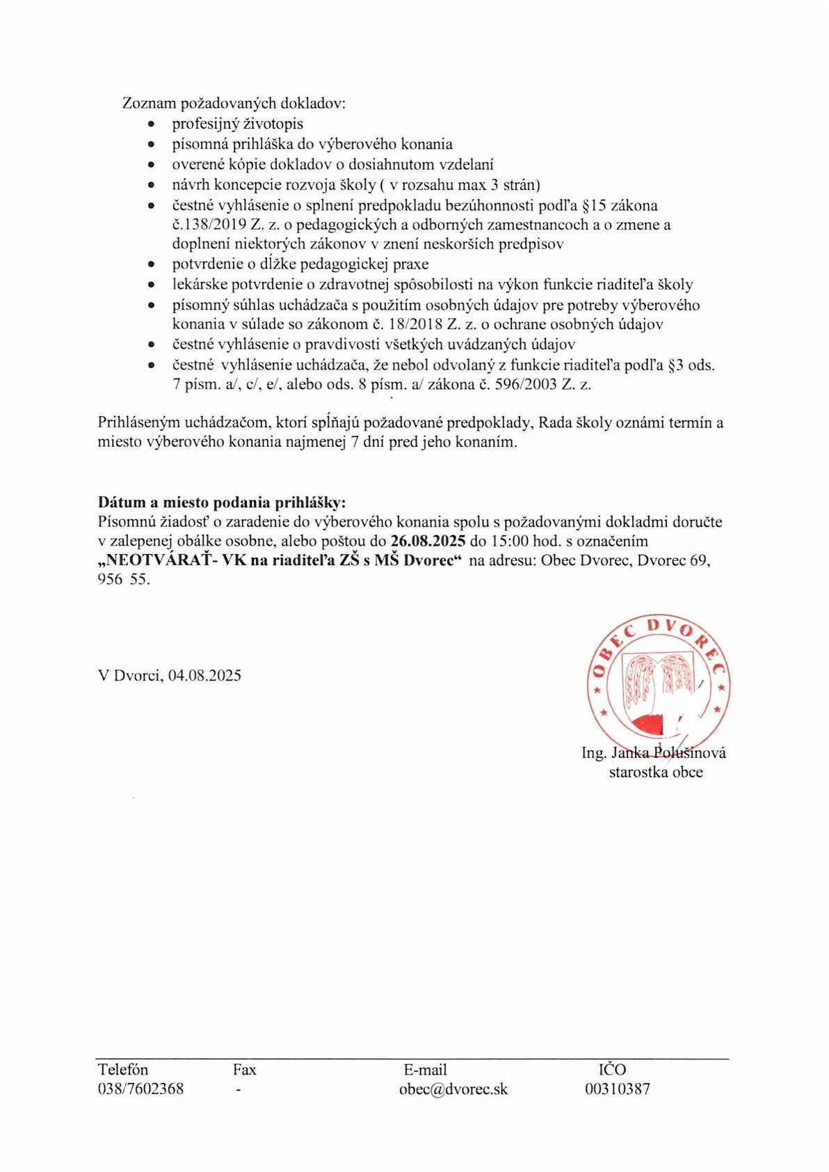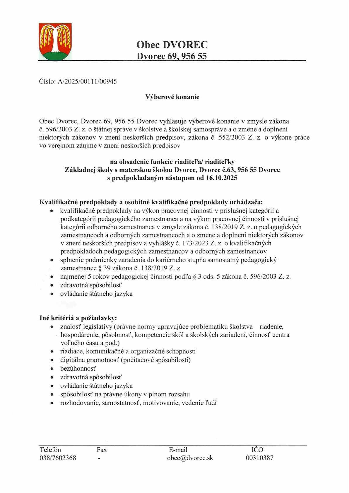 Výberové konanie na obsadenie funkcie riaditeľa ZŠ s MŠ Dvorec
